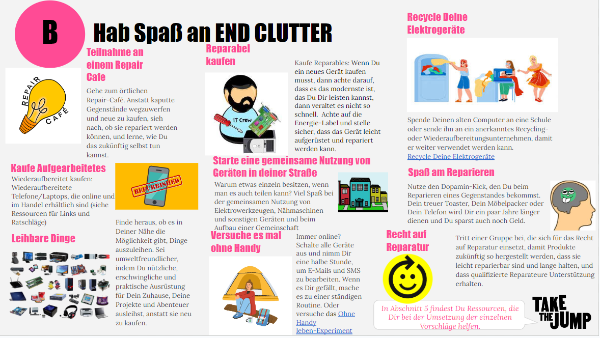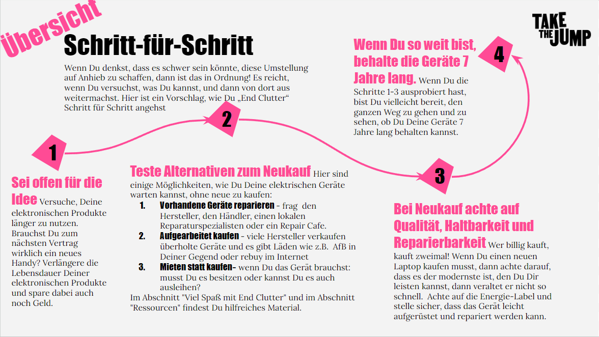 Schau dir unseren neuen Wegweiser zu END CLUTTER an! Er enthält alle Informationen dazu, wie du Änderungen Schritt für Schritt angehen kannst - mit praktischen Tipps und Hilfsmaterial zur Umsetzung.